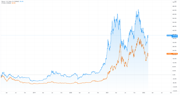 This chart shows the percentage moves in both BTC and ETH over the past 3 years. As you can see, from this chart, BTC and ETH move very much in tandem with each other. Many cryptocurrencies are heavily influenced by the movements of the ‘Big 2’ (ETH and BTC).