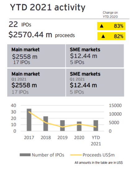 The Indian IPO markets have been in somewhat of a spotlight lately. Indian stock exchanges ranked ninth in the world by number of IPOs year to date where Q1 2021 saw 17 IPOs versus 1 at the same time last year. However, despite the recent performance in proceed size, the general trend seen in the graph produced by EY below indicates that since 2017, the number of IPOs and size of proceeds has generally been decreasing.