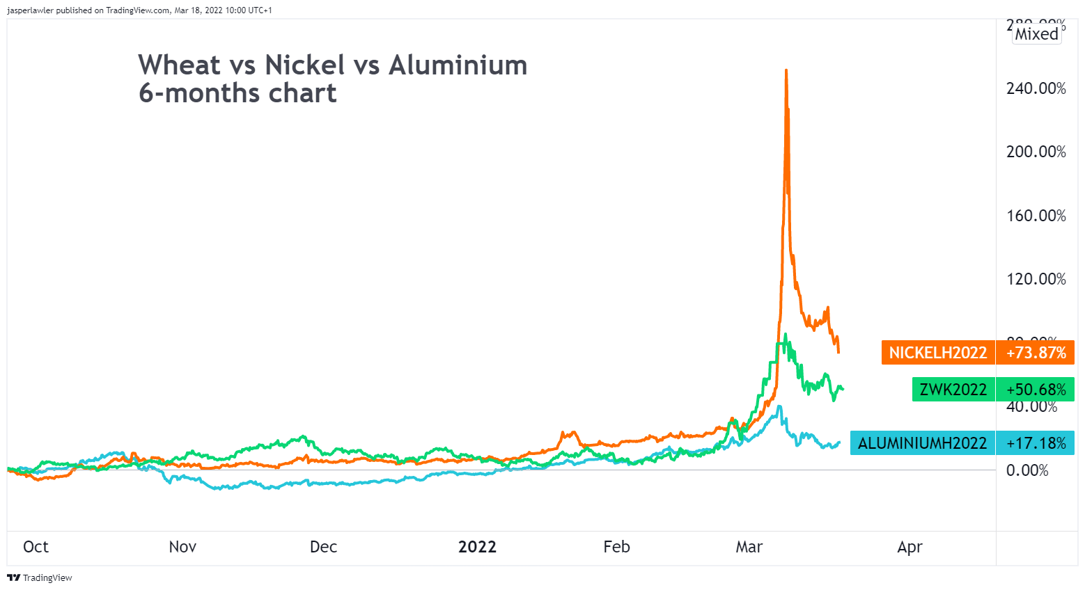 For wheat and nickel, such a scenario would likely mean prices coming lower as traders anticipate reduced supply issues. It may be that commodity supply from these two countries never returns to pre-war levels, implying higher than pre-war prices. However given the huge build up in speculative positions, margin calls could prompt panic selling and a complete reversal of the YTD gains.