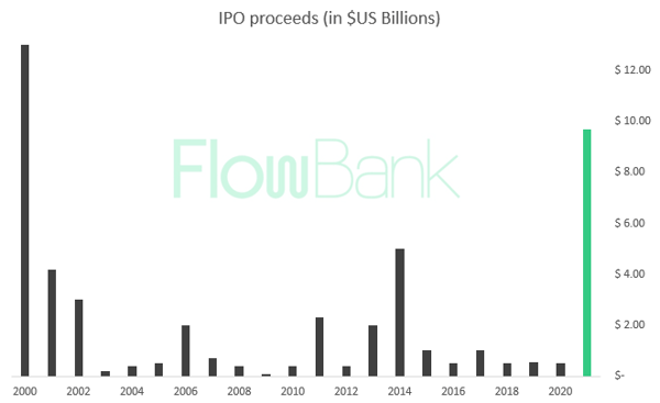 On, is not the only Swiss firm listed in New York and in fact, there has been a rising trend for European players as of late to join American public markets, a trend seeing its largest momentum since 2000 (see next graph). The reasons for a two billion plus company to list in New York is broadly a question of liquidity--the SIX (the Swiss stock market) is recognized worldwide (it houses massive companies like Nestle and Novartis) but it does not offer as many investors and as much trading volume. The US is the best place for a large company to find preliminary primary market investors and once the IPO is announced, to pocket some more proceeds from the public.